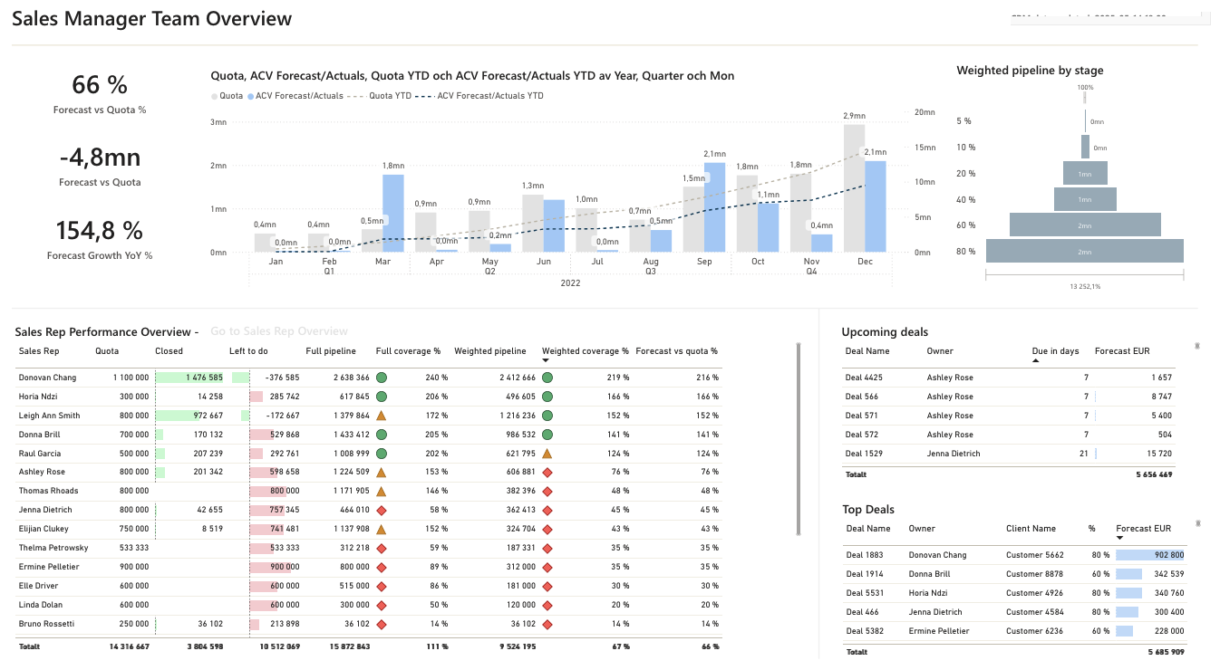 Det här är en dashboard som ofta skapas för säljavdelningen på företaget. Varje sida är anpassad utifrån olika personers roller och vad de har nytta av att veta och få insikt om. Det finns många fördelar och ett högt värde i att få datan visualiserad på det här viset.